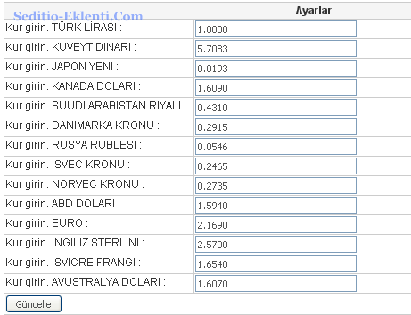 Kur Bilgileri Admin Panelden Eklenmektedir.