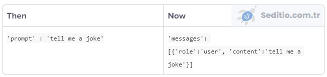 İsteminiz olarak tek bir dize göndermek yerine, girdiniz olarak bir mesaj listesi gönderirsiniz.