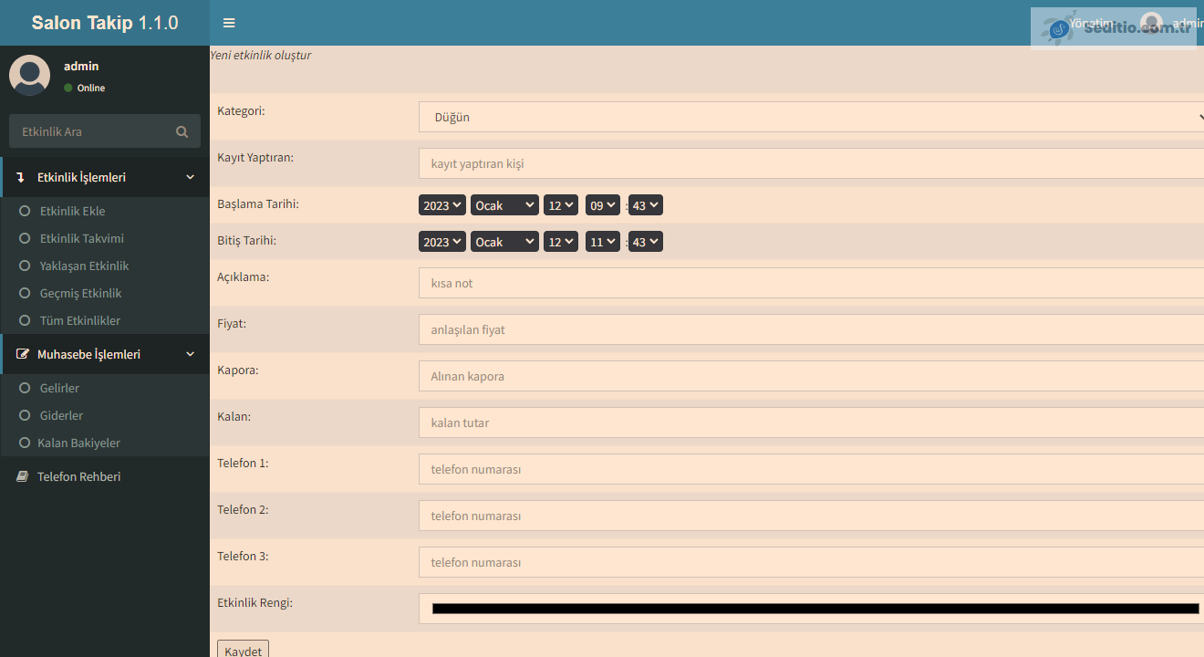 Salon, Dernek vb.. İşletmelerin kullanabileceği Salon Takip Scripti v.1.1.0 Etkinlik Takvimi ile yapılacak etkinlikleri kaçırmazsınız. Etkinlik Renklendirme özelliği eklendi. https://nt.web.tr/demo/salontakip/plug/calendar Gelir ve Gider Takibi Yapmanız için Muhasebe özelliği eklendi. Müşterilerinizin kaydını tutmanız için telefon defteri eklendi. Sınırsız kategori ekleyebilirsiniz. Kategorileri listeme özelliği eklenmiştir. Geçmiş etkinlikleri listeleme ve filtreleme Gelecek etkinlikleri listeme ve filtreleme Açık Kaynak Olarak verilecektir. Geri İade Kesinlikle Yoktur. Geliştirmeye Açıktır. Kurulum Ücretsiz olarak tarafımca yapılacaktır. Php 7.4 ve Cpanel Sistem gereksinimi veya Localhost da kullanabilirsiniz. Demo Adresi: https://nt.web.tr/demo/salontakip/