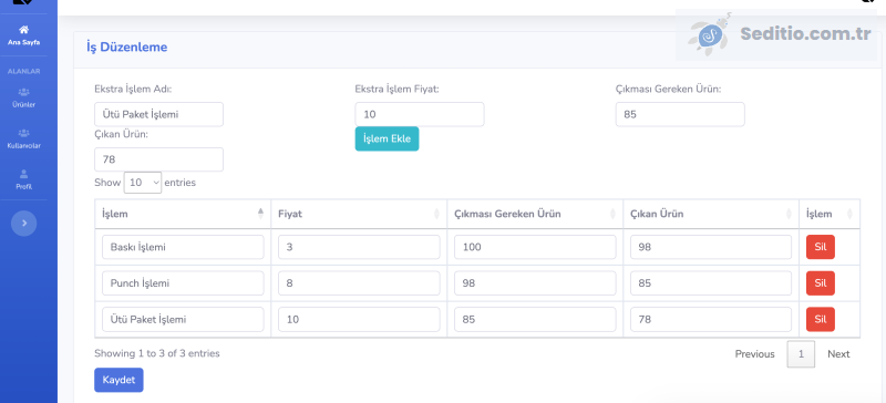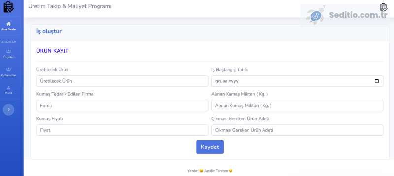 Üretime girişin yapılması ve her aşamasına ait ücretlendirme ve adet takibini sağlamaktadır.